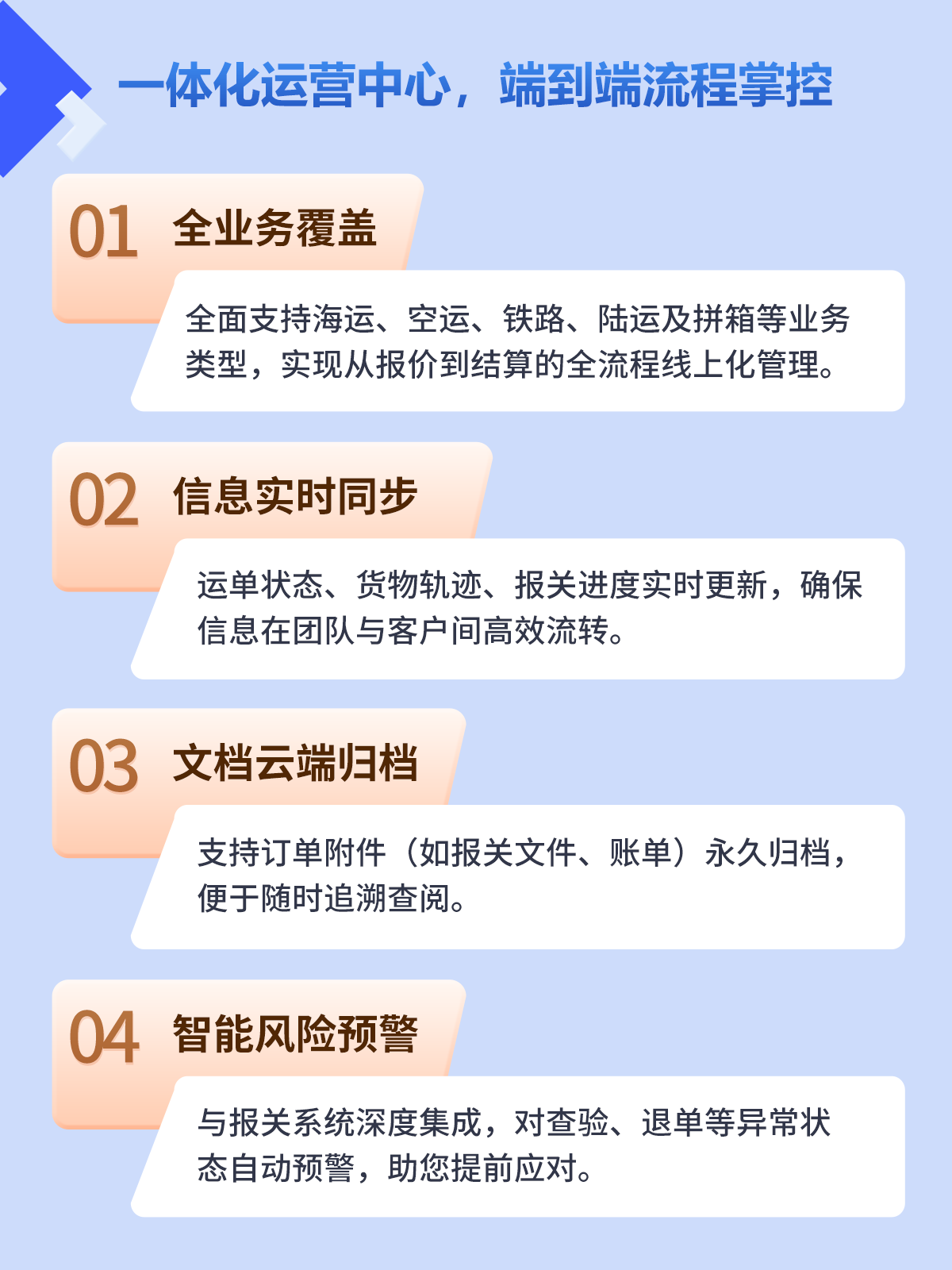 全业务覆盖:全面支持海运、空运、铁路、陆运及拼箱等业务类型,实现从报价到结算的全流程线上化管理 ⏱️信息实时同步:运单状态、货物轨迹、报关进度实时更新,确保信息在团队与客户间高效流转 ☁️文档云端归档:支持订单附件(如报关文件、账单)永久归档,便于随时追溯查阅 ⚠️智能风险预警:与报关系统深度集成,对查验、退单等异常状态自动预警,助您提前应对