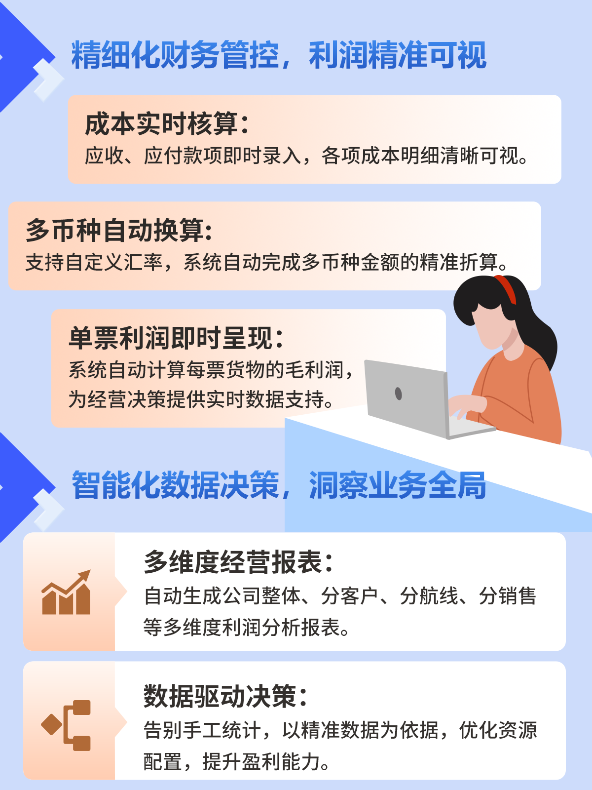 多维度经营报表:自动生成公司整体、分客户、分航线、分销售等多维度利润分析报表